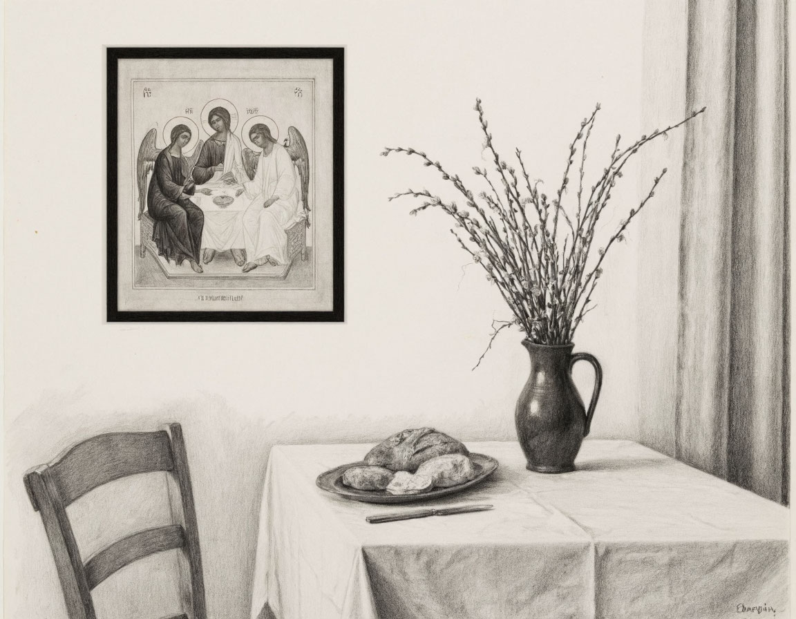 Завершить оформление можно небольшими рукодельными деталями: например, прикрепить к салфеткам листочки берёзы или вложить в каждую тарелку открытку с цитатой из молитвы или поздравлением. Такие мелочи сделают праздник по‑настоящему личным и запоминающимся.