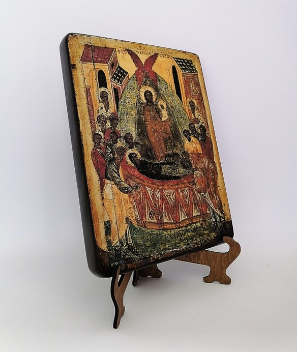 Основа иконы, изготовленной нашими верующими мастерами, доска из хвойных пород дерева, что позволяет её назвать - “живой” иконой. Природный материал несёт в себе живую энергетику. Эффект состаривания – придаёт особый колорит. Такая икона гармонично смотрится практически в любом интерьере.
